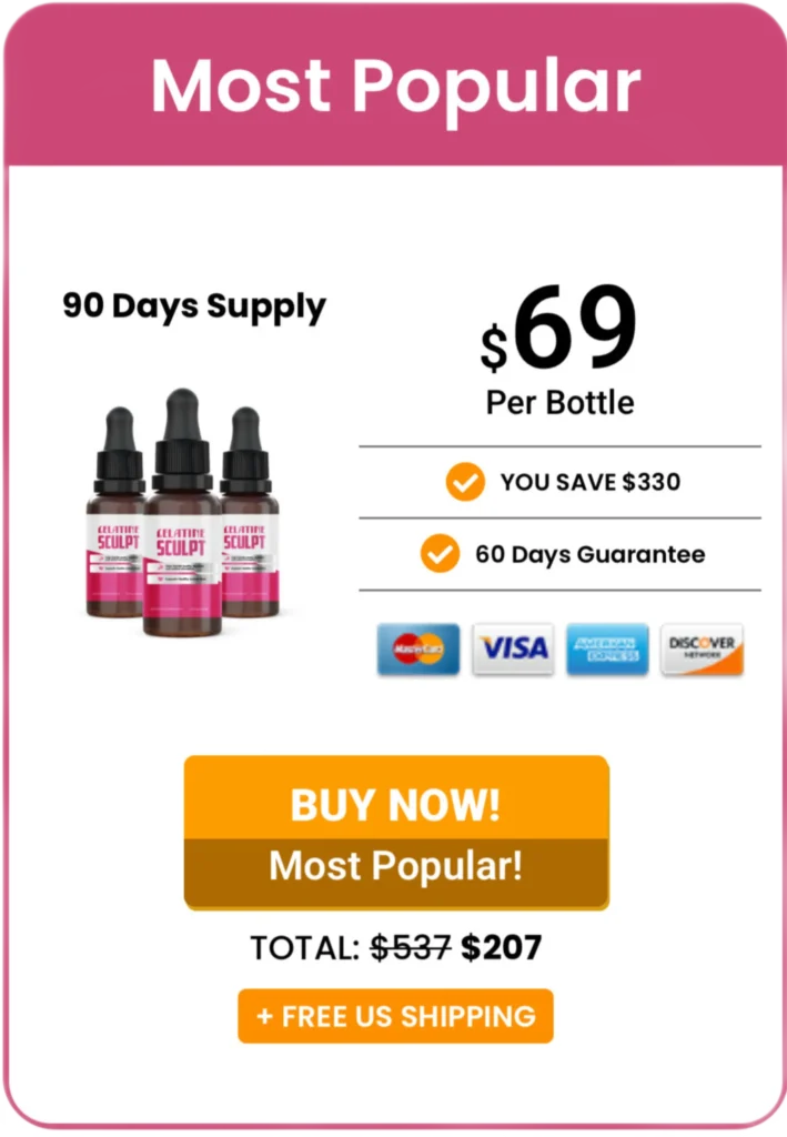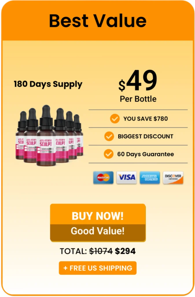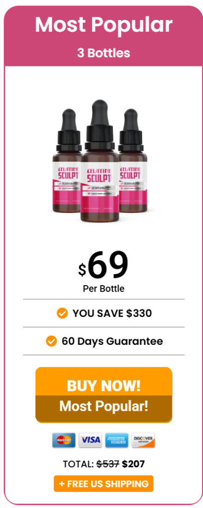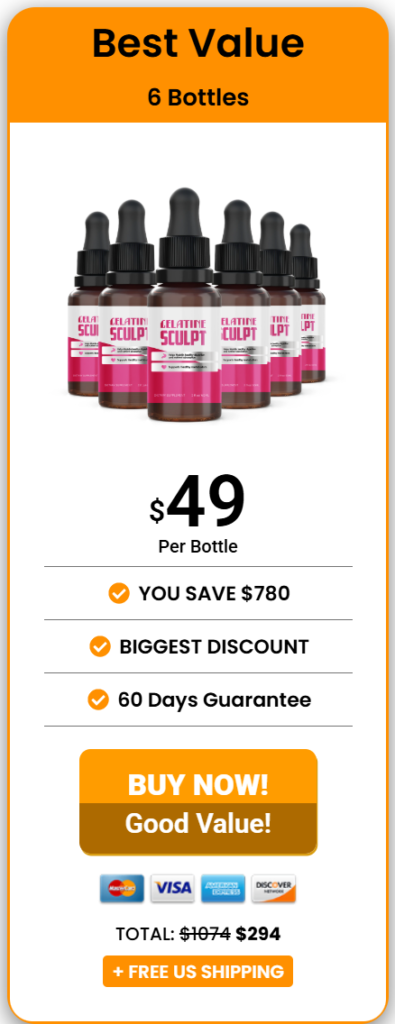 Our recommendation: If you’re seriously considering Gelatine Sculpt, the 6-bottle package is the most strategic choice. It gives your body the full 60-day window to respond, locks in the lowest price per bottle, and keeps you covered by the money-back guarantee — so the risk stays with the manufacturer, not with you.